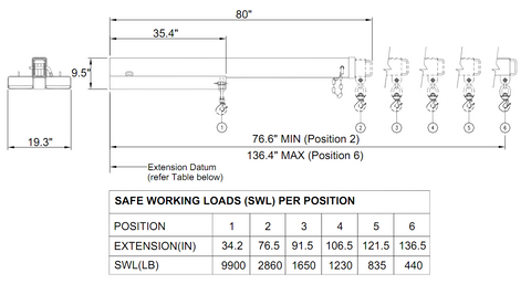 - 9900 lbs at first position to 440 lbs fully extended