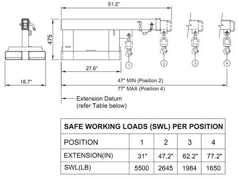 The type FJS2.5 jib allows for additional lifting height with the extension beam being raised above the fork pockets. The overall length when retracted is 51'', and when extended is 78''.