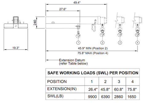 - 9900 lbs at first position to 1650 lbs fully extended